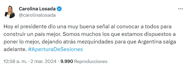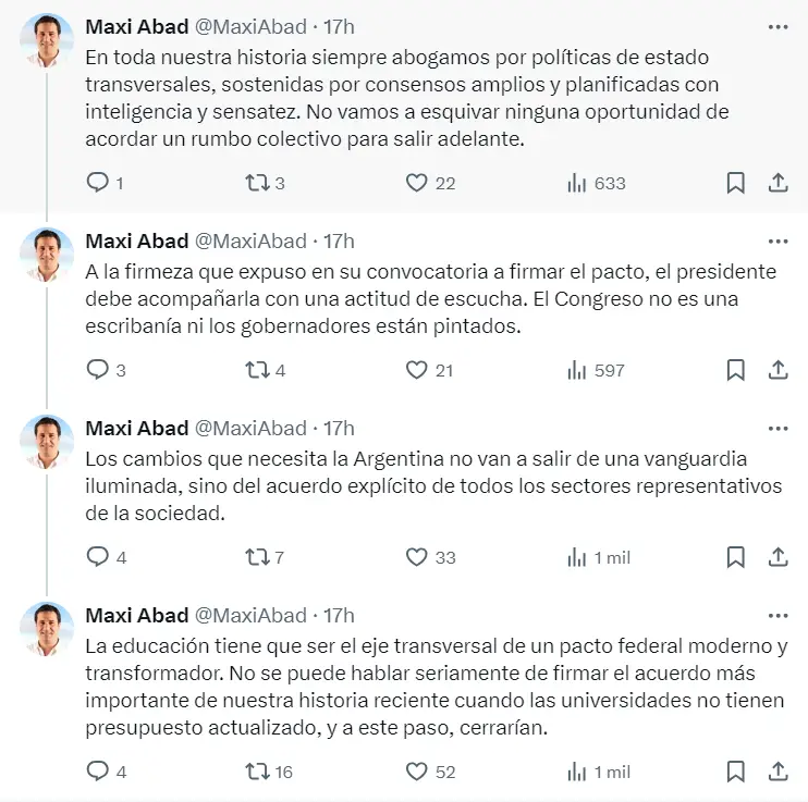 El gobernador de Santa Fe, Maximiliano Pullaro, también se expresó de manera positiva: “Quiero destacar la convocatoria al diálogo y a un acuerdo nacional que realizó el presidente Javier Milei. Es el tiempo de escucharnos con respeto, sin imposiciones. Todos tenemos la oportunidad de impulsar el cambio que los argentinos reclaman y necesitan”.