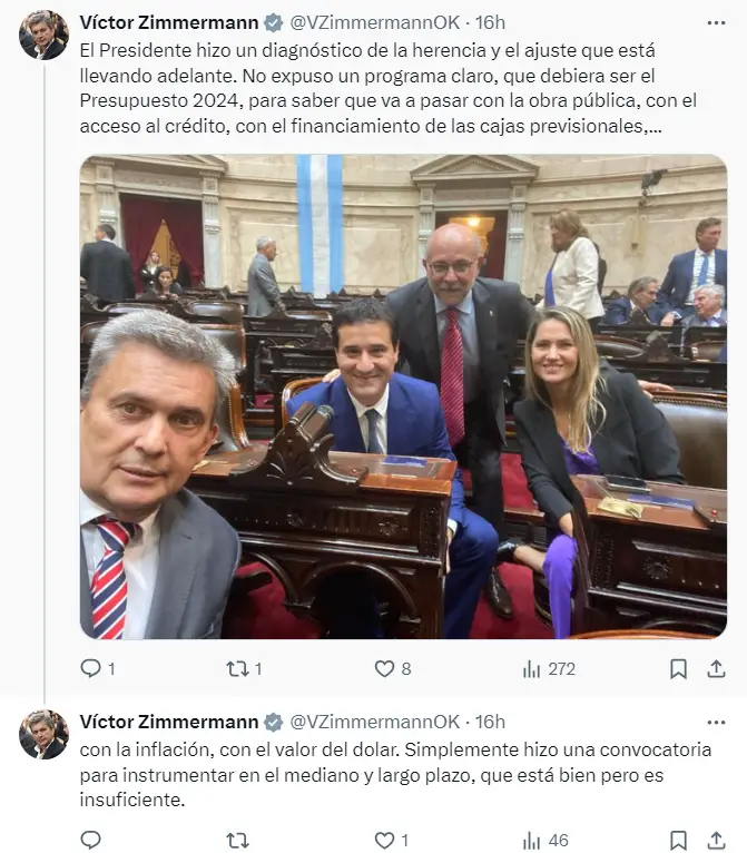 Uno de los primeros en expresarse a favor del discurso fue el gobernador mendocino, Alfredo Cornejo. A través de sus redes sociales, aseguró que Milei “trazó el rumbo legislativo” y que valoran la convocatoria al pacto político “por la economía y la sociedad”. Al mismo tiempo, aseguró que “muchas de las iniciativas planteadas por el Presidente, son parte del camino recorrido en Mendoza durante los últimos años”.