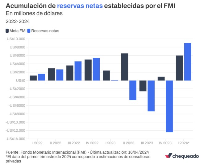 El organismo incluso permitió una pérdida de hasta US$ 2.600 millones en el tercer trimestre para finalizar el año con la suma de US$ 900 millones. Sin embargo, a excepción del primer trimestre de 2023 (en el que se acumularon US$ 100 millones), en todos los períodos se registraron caídas de las reservas netas hasta terminar el año con pérdidas de US$ 12.400 millones.