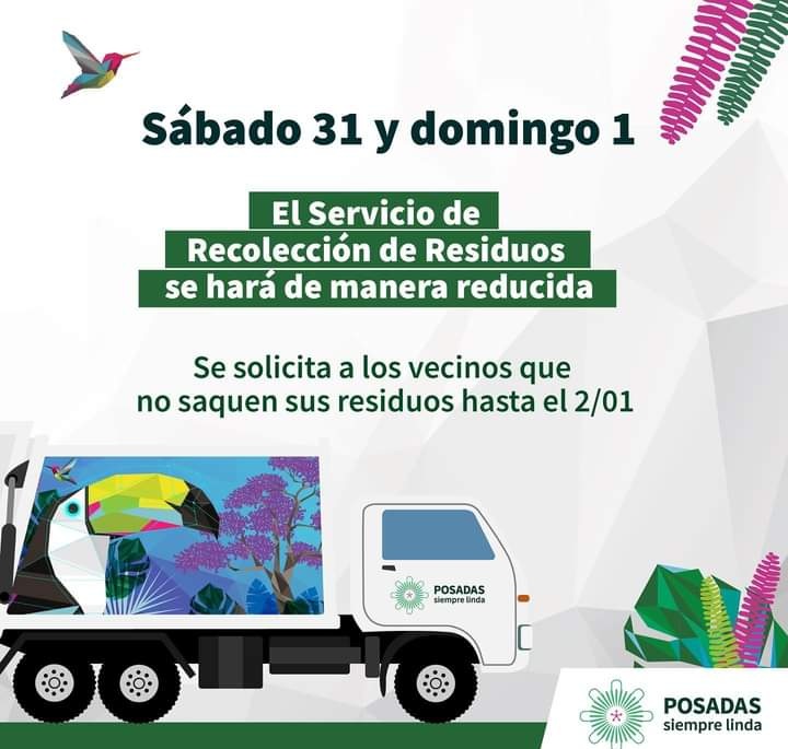 Este sábado 31 de diciembre y domingo 1° de enero, la recolección de residuos se realiza de manera reducida, por tal motivo, se solicita a los vecinos que eviten sacar los desechos hasta el lunes 2, día en el cual el servicio se reestablecerá en forma habitual.