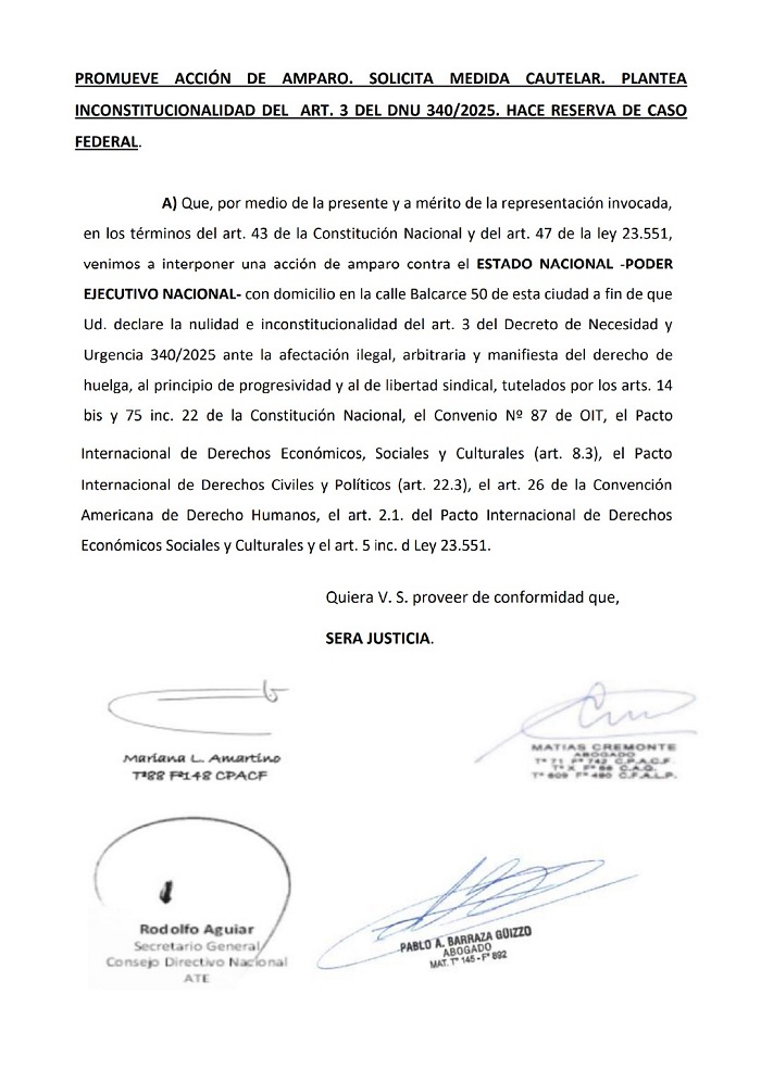 La presentación lleva la firma del secretario general de ATE Nacional, Rodolfo Aguiar, junto con los apoderados Matías Cremonte y Mariana Laura Amartino, y el patrocinio de Pablo Barraza Guizzo.