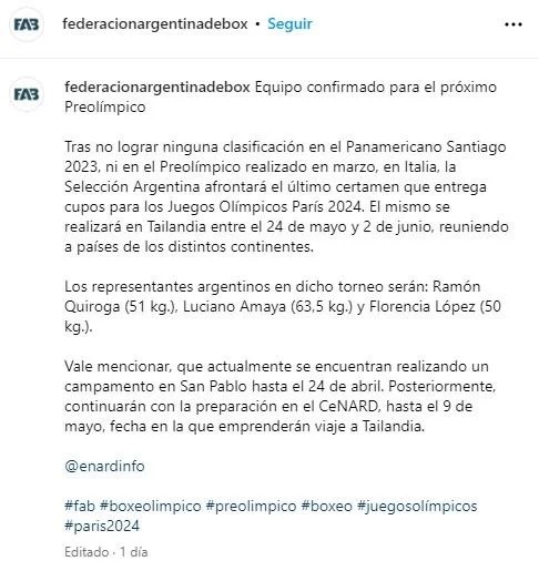 La Federación Argentina de Box dio la noticia más esperada para los representantes del seleccionado nacional de dicho deporte de cara a los Juegos Olímpicos que tendrán lugar en Paris, Francia. La entidad que rige el pugilismo a nivel local comunicó los nombres de quienes buscarán una plaza en dicha competencia por medio de un certamen que comenzará en las próximas semanas. Los mismos ya tuvieron una oportunidad de clasificar en un Preolímpico que se desarrolló en Italia en marzo, no lo lograron y ahora viajarán a Tailandia para buscar ese objetivo.