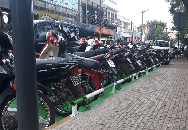 En el marco de las acciones del ordenamiento de los espacios en el centro de Posadas, la Municipalidad comenzó a instalar palenques antirrobos en los sectores delimitados para el estacionamiento de motos.