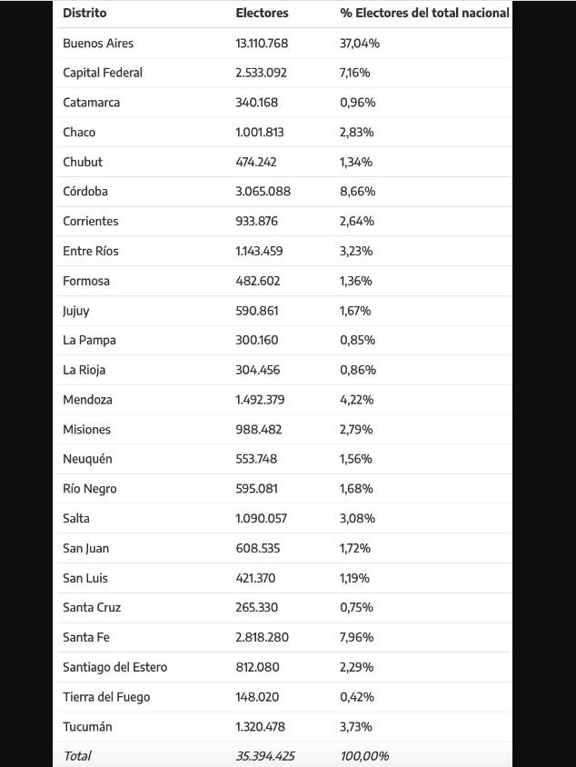 La Provincia de Buenos Aires es el distrito que, por amplia diferencia, mayor cantidad de electores/as tiene. Las personas habilitadas para ejercer el voto son 13.110.768 representando un 37,04% del total del país.