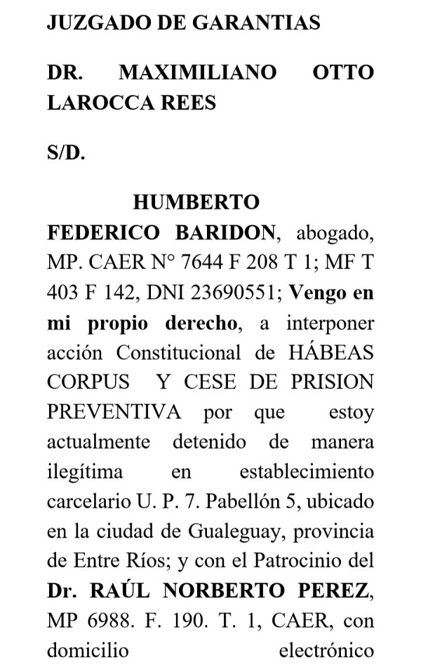 En la segunda semana de abril me apersono con un Amparo de Habeas Corpus en el Superior Tribunal de Justicia de la Provincia de Entre Ríos, que es donde está la causa, en ese momento me lo rechazaron. Hubo una discusión, porque le digo si me lo rechazan en la justicia dónde lo presento, ¿a la Policía?, ¿al Gobernador?, ¿a quién? A lo que me contestan que lo presente en un Juzgado de Primera Instancia. Así que elegí al azar un Juzgado de Garantía, y me lo rechazaron también. A las 24 horas, me lo rechazan por extemporáneo. Entonces, decidimos con el Doctor Mauro Cardozo, que es de La Plata, y con la familia presentar un nuevo recurso de Habeas Corpus en otro Juzgado –quiero aclarar que para presentar este recurso se puede hacer en cualquier Juzgado del País y por cualquier persona no necesariamente tenés que ser abogado-. Lo presentamos en la ciudad de Federal, en el Juzgado de Garantía, a cargo del Doctor Larocca Ritz, y pide que se oficie, a la Unidad Penal, un informe de la situación de salud de Baridon y ordena una audiencia al otro día entre Baridon, el propio Juez y mi persona como patrocinante. Esta audiencia está grabada, pero, al solicitar una copia no me la han querido dar. Allí se ha documentado todas las denuncias realizadas por Baridon, detallando toda su situación. Nos rechazan las denuncias del Dr. Baridon. Tras este nuevo rechazo, apelamos y solicitamos que se apersone un médico y un Juez a la Unidad Penal y que vean por sus propios ojos en las condiciones infrahumanas que lo tienen. ¿Y cuál ha sido la respuesta?, nos lo vuelven a rechazar. Esta vez, no por extemporáneo sino por “plazo corto”. Personalmente, es la primera vez que veo este justificativo para fundamentar un nuevo rechazo a nuestras presentaciones. Es decir, presentación que hemos hecho, presentación que han sido sistemáticamente rechazadas. Mientras tanto, Baridon se encuentra en una Unidad Penal, sin condena, con una prisión preventiva sin plazo, lo que es una ilegalidad, y nadie hace nada.