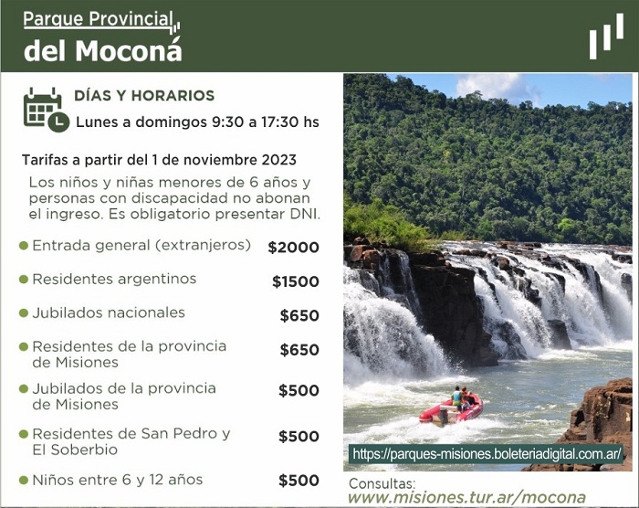 Los/as niños/as menores de 6 años y personas con discapacidad, entran gratis; los/as niños/as entre 6 y 12 años y los jubilados de la provincia, abonarán $500; residentes de Misiones y jubilados nacionales, $650; los residentes argentinos: $1500, mientras que la entrada general (extranjeros) es de $2000.