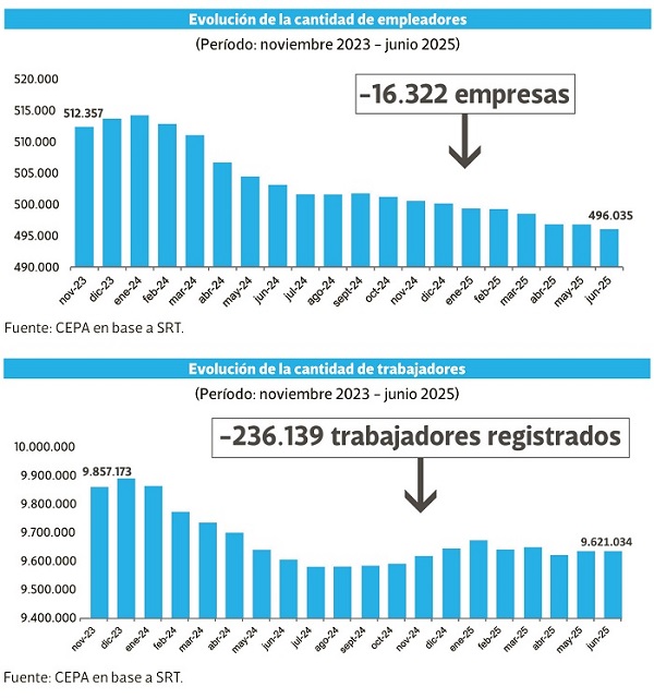 Esos son apenas algunos casos de una situación que se reproduce a diario desde que asumió el gobierno de Javier Milei. Literalmente. Un informe que se conoció esta semana elaborado por el Centro de Economía Política Argentina (CEPA) indica que, desde noviembre de 2023 a junio de 2025, cerraron sus puertas 16.322 empresas. Se trata de una contracción del 3,2% sobre el total de 512.537.