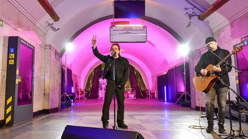 Bono brindó un show en la estación Khreschatyk de la capital ucraniana junto al guitarrista de U2 The Edge y a Taras Topolia, líder de la popular banda ucraniana “Antytila”, quien tras la invasión de Putin se alistó en el ejército para defender a su país. La estación Khreschatyk es uno de los lugares más seguros de Kiev. Allí el presidente Volodimir Zelensky dio recientemente una larga conferencia de prensa.