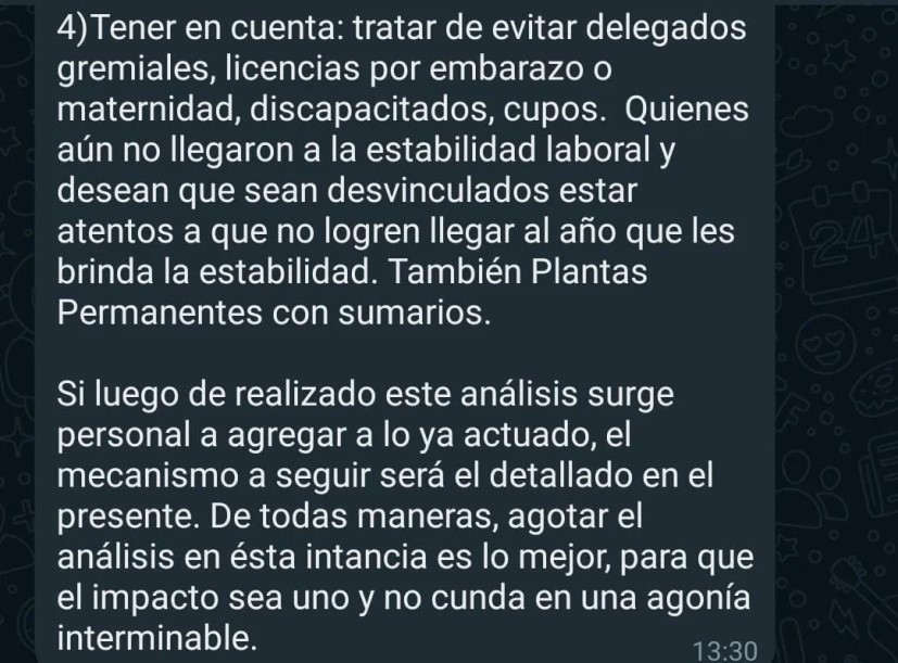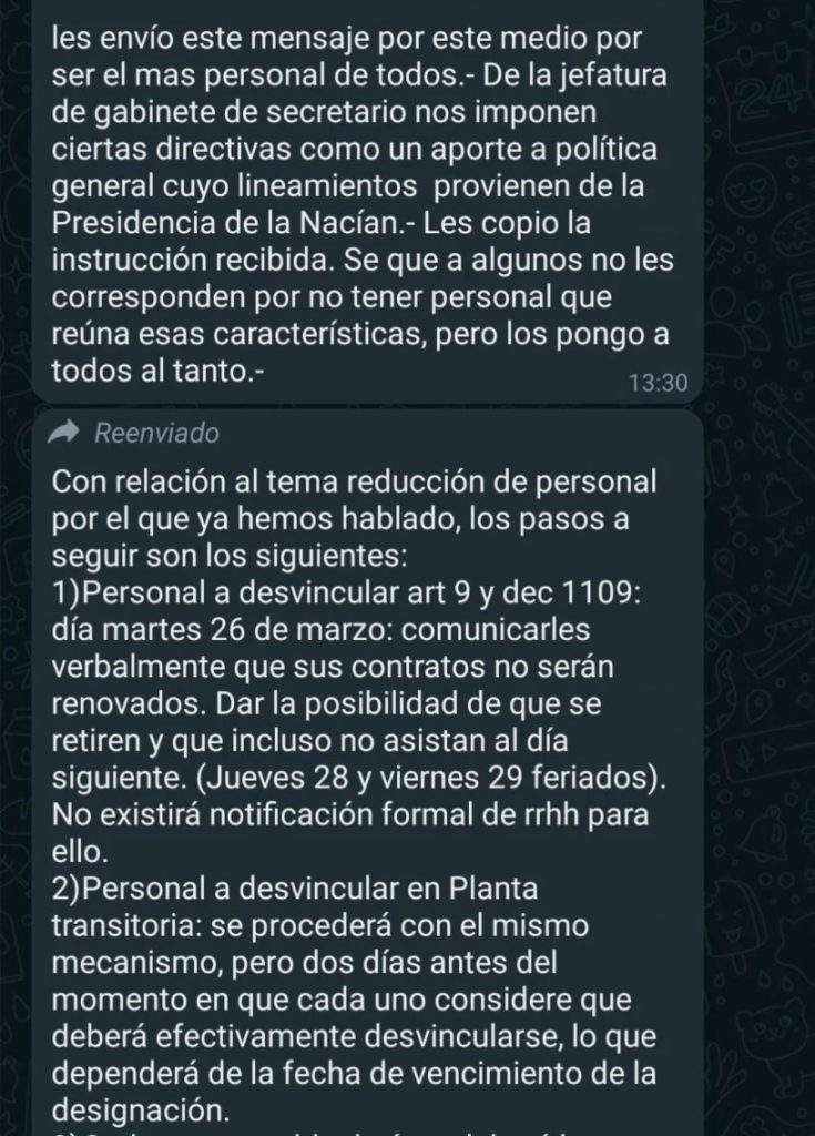“De JGM nos imponen ciertas directivas”, comienza el mensaje con los pasos a seguir en “relación al tema reducción de personal”. En primer término, se establece que los despidos se realizarán el martes que viene, el 26 de marzo. Recomienda en el punto número uno: “Comunicarles verbalmente que sus contratos no serán renovados. Dar la posibilidad de que se retiren y que incluso no asistan al día siguiente”. Ese sería el último día trabajado para ellos y luego le seguirán los feriados de semana santa hasta el comienzo de abril. Además se les informa a los funcionarios a cargo que los despidos no serán oficializados: “No existirá notificación formal de RRHH”.