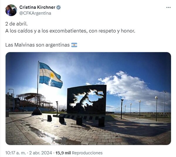 El texto está acompañado por una foto del mural escultórico Héroes de Malvinas, ubicado en Ushuaia, Tierra del Fuego. Allí la expresidenta encabezó el acto oficial en el año 2012, cuando se recordaron los 30 años del inicio del conflicto bélico.