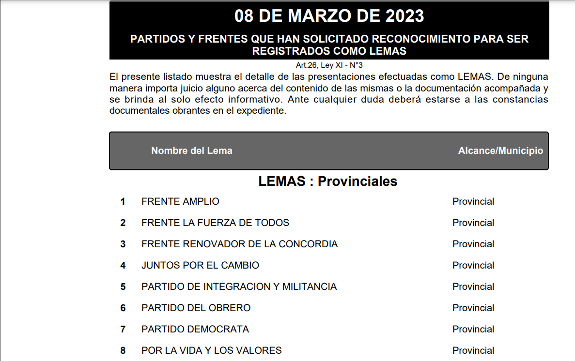 Ayer finalizó el periodo de registro para los lemas que competirán en los comicios provinciales del próximo 7 de mayo. Este jueves, el Tribunal Electoral de Misiones informó cuales son los inscriptos: