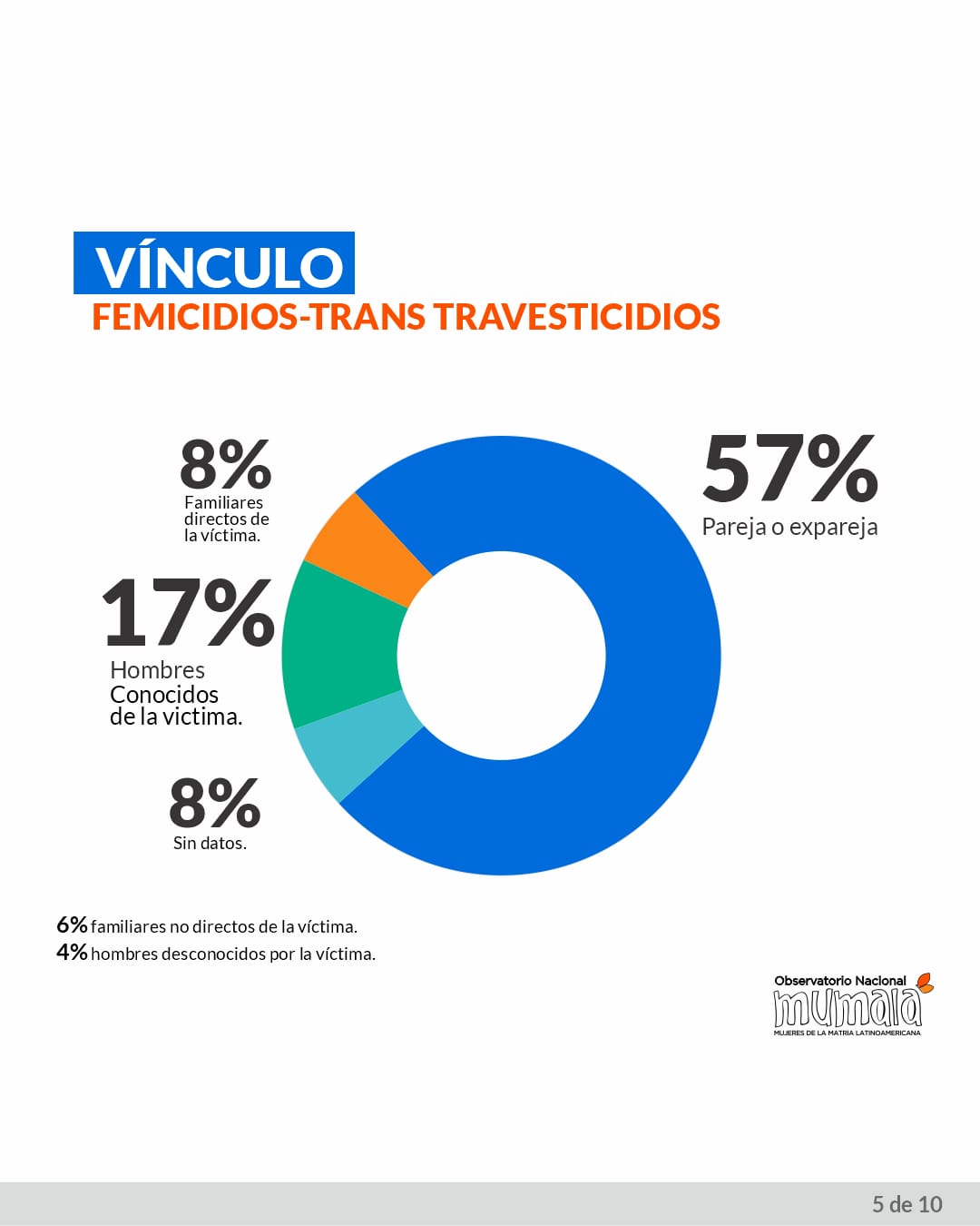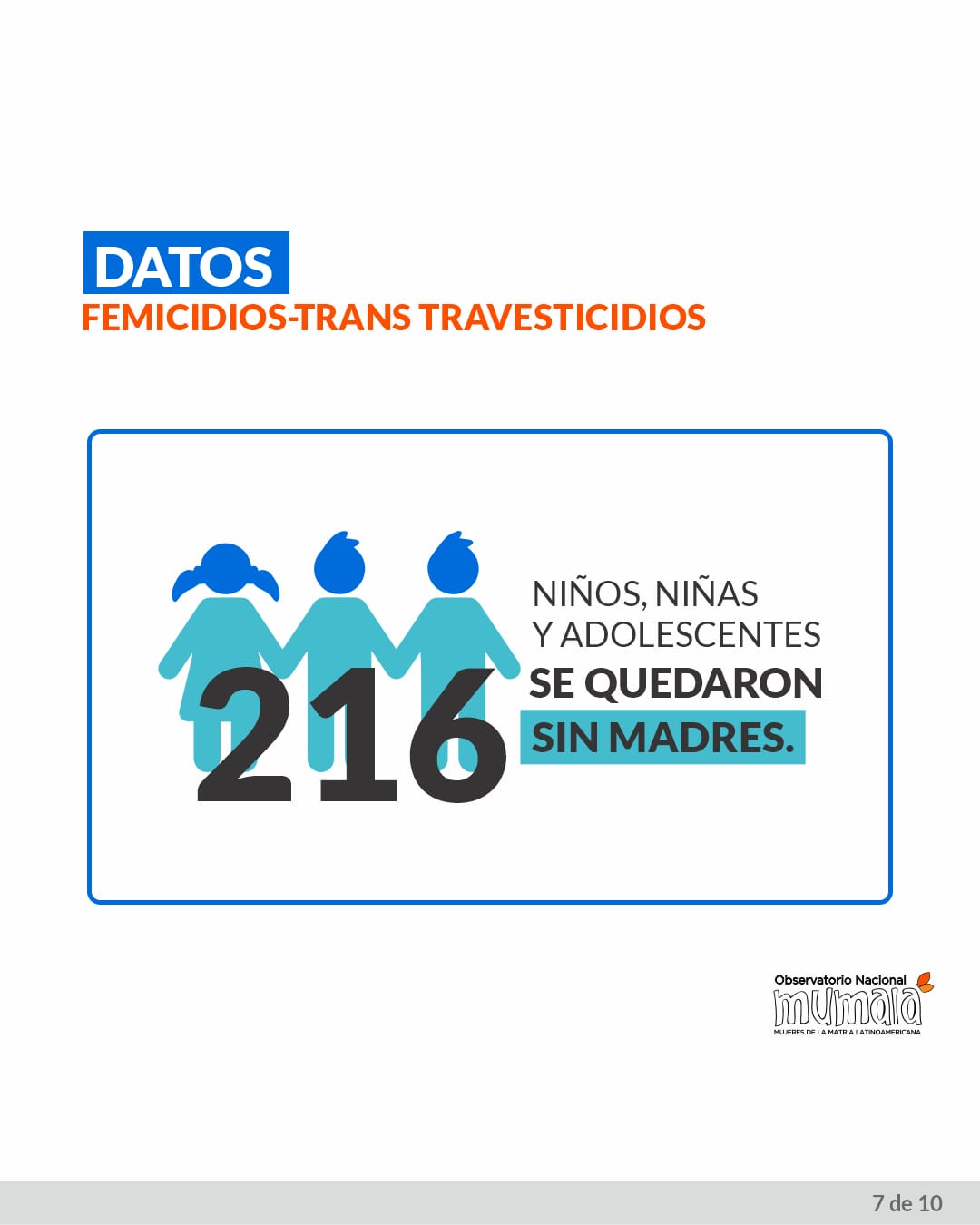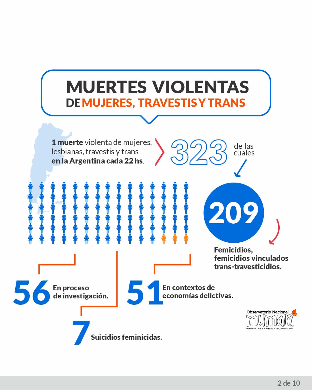 Nuevamente, el Registro Nacional de Femicidios, Femicidios Vinculados, Trans/Travesticidios y otras muertes violentas proporcionado por el Observatorio MuMaLá, arrojó que del 1° de enero al 30 de octubre se perpetraron un total de 323 muertes violentas de mujeres, travestis – trans en lo que va del año, a razón de una cada 22 horas.