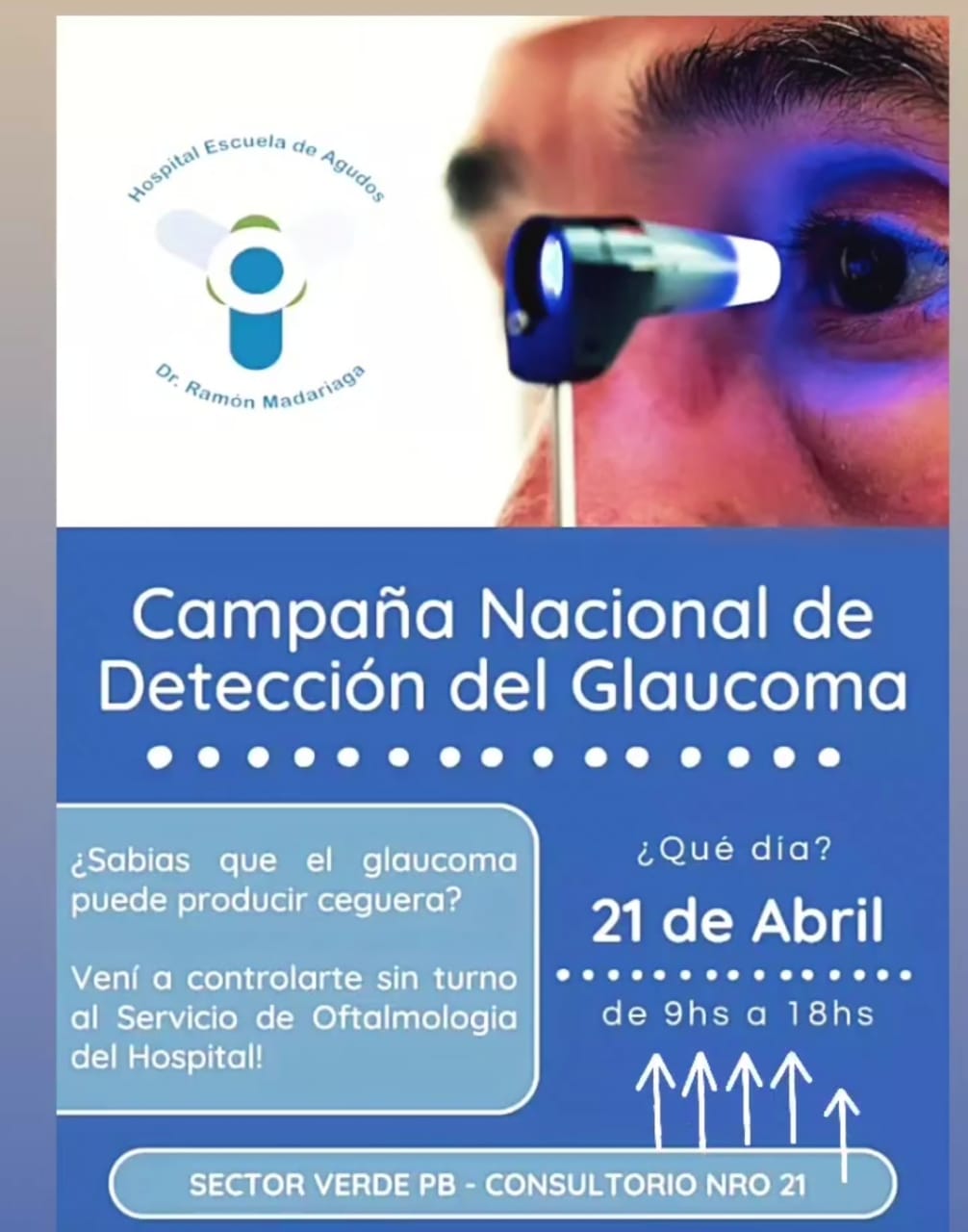 El Hospital Escuela de Agudos “Dr. Ramón Madariaga”, a través del Servicio de Oftalmología, se suma a la Campaña Nacional de Detección del Glaucoma, por lo que anuncian que habilitarán un consultorio de detección de la patología, el 21 de abril, de 9 a 18 horas, en el Sector Verde, PB, Consultorios Externos, del citado Nosocomio. La actividad será totalmente gratuita, sin turno previo, por demanda espontánea.