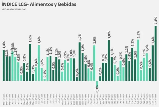 De acuerdo a un informe de LCG al que pudo acceder El Destape, en la tercera semana de marzo la suba de precios de los alimentos promedió 2,44% y se trató del incremento semanal más alto del que tenga registro la consultora. El indicador se aceleró casi un punto porcentual respecto a la semana anterior y preocupa lo que viene reflejando marzo.