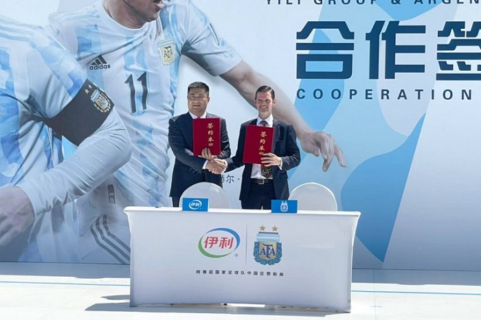 La Asociación del Fútbol Argentino (AFA) y la empresa china Yili Group firmaron este jueves en Beijing un acuerdo para incorporar a la firma láctea más importante de Asia como nuevo sponsor regional de la Selección Argentina. Participaron del evento el embajador de la Argentina en China, Sabino Vaca Narvaja; el presidente ejecutivo de Yili Group, Liu Chunxi; y el vicepresidente de Wanda Culture Group y presidente de Wanda Sports China, Gao Yimin.