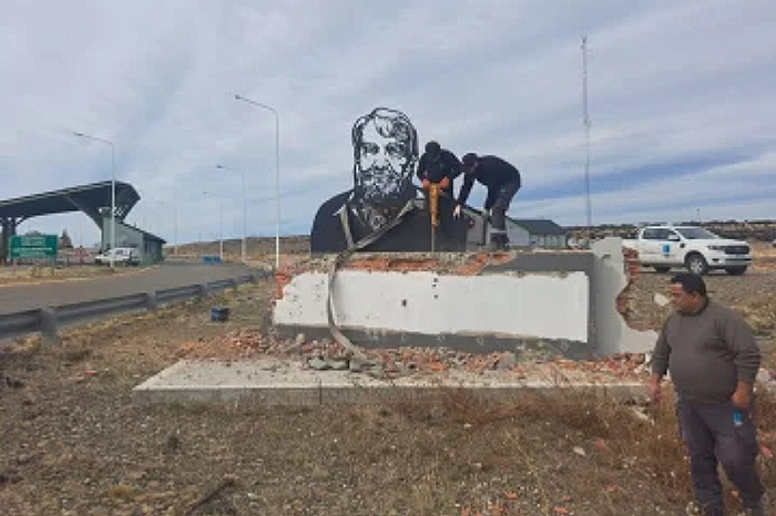 Con una excavadora y martillos neumáticos, una cuadrilla de Vialidad Nacional derrumbó la imagen del escritor de “La Patagonia rebelde”, en Río Gallegos.