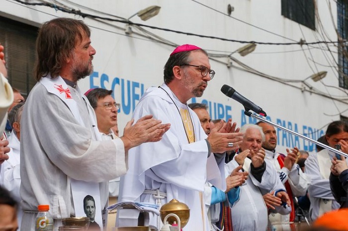 Al mediodía zarpa la ceremonia. Llega al escenario una imagen de la virgen de Caacupé en los hombros de los vecinos. Decenas de curas de opción por los pobres se arriman al frente. El obispo Gustavo Carrara, responsable de la Pastoral de las Villas de la Ciudad de Buenos Aires, dirige la batuta.