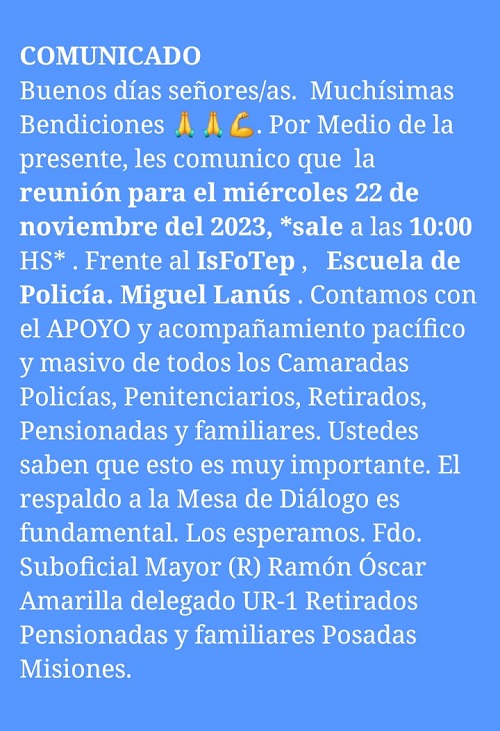 El Suboficial Mayor (R) Ramón Amarilla realizó una convocatoria a través de Radio Lateral para una movilización que ocurrirá mañana miércoles 22 de noviembre de 2023 a las 10hs, en el IS.Fo.Te.P, Escuela de Policía en Miguel Lanús, Posadas.