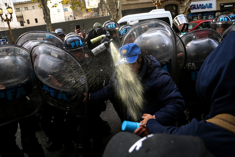 La particularidad de este miércoles es que las calles estaban sin cortes, pero los agentes igual buscaron desalojar a los manifestantes de la Plaza de los dos Congresos en un clima de tensión. La Gendarmería, de hecho, avanzó sobre quienes estaban en la vereda y gasearon a distintos fotógrafos, entre ellos Antonio Becerra de Tiempo Argentino.