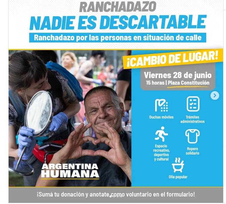 El espacio político liderado por Juan Grabois, Argentina Humana, realizará este viernes a partir de las 15hs en Plaza Constitución una jornada solidaria de acompañamiento a personas en situación de calle en donde habrá olla popular, duchas móviles, posta de trámites administrativos, un espacio recreativo para niñeces en situación de calle, entre otros. Se trata de una actividad que “confronta con el proyecto cruel e inhumano de Milei en nación y de Jorge Macri en la Ciudad”, afirmaron desde la organización.