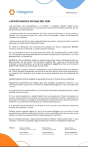 “Si el Ministerio de Economía no le entrega a Chubut sus recursos, entonces Chubut no entregará su petróleo y su gas”, afirmó el comunicado firmado por los gobernadores Gustavo Melella (Tierra del Fuego), Claudio Vidal (Santa Cruz), Sergio Ziliotto (La Pampa), Rolando Figueroa (Neuquén), Alberto Weretilneck (Río Negro) y Torres.